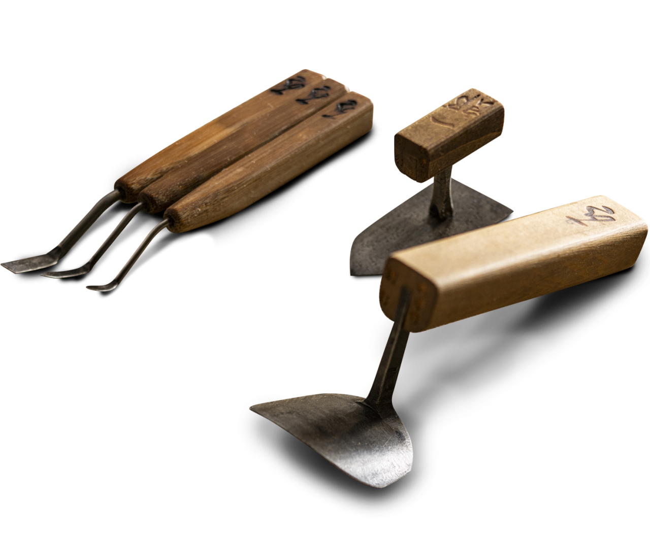 左官仕事には、鏝(こて)や刷毛(はけ)をはじめ、多くの道具が必要です。職人たちは自分だけの道具を用意し、それぞれが責任を持って管理するのが当たり前。仕事への理解度や自らの技量への眼差しが、如実に現れます。古くから道具の扱いを見れば自ずとその職人のレベルがわかるとされる所以です。